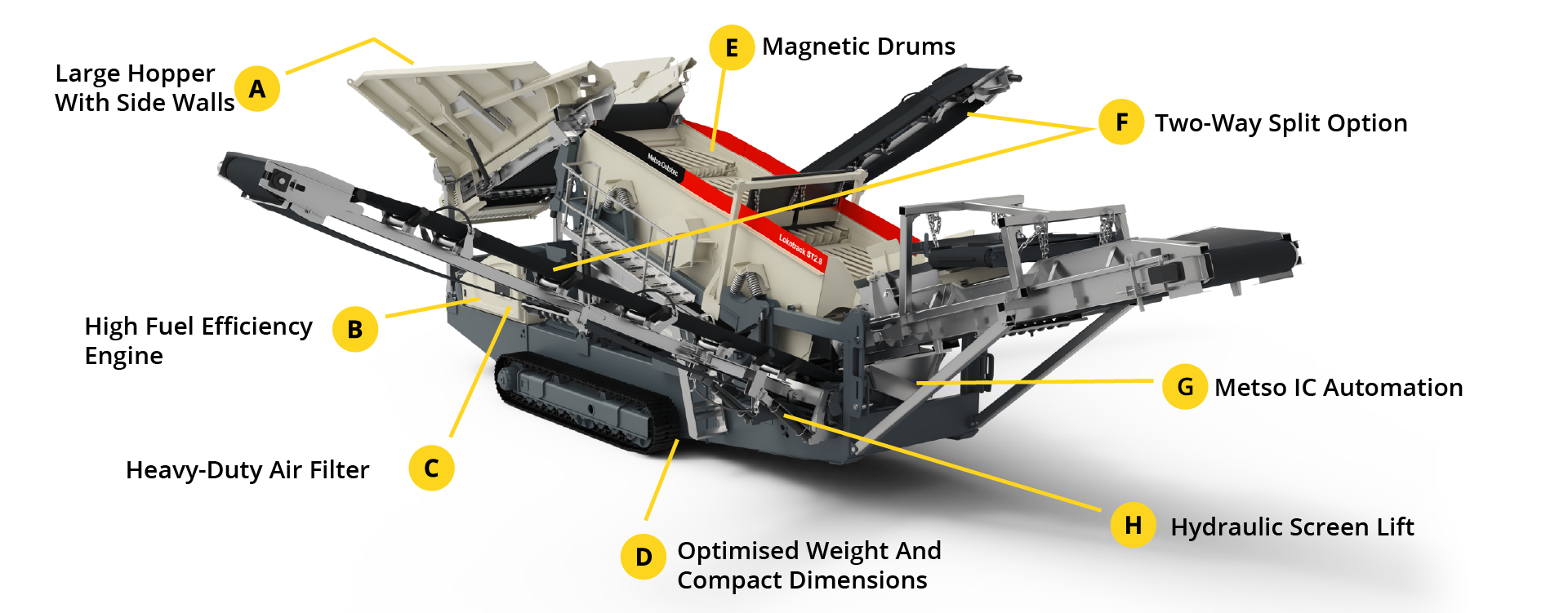 The innovative two-way split option enables the combination of materials from both the top and bottom decks onto the oversize conveyor.