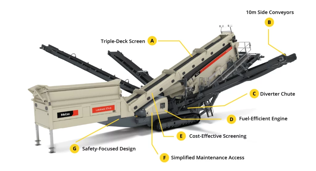 The Lokotrack ST4.8 features a 5.48 x 1.52 m screen with three decks, capable of producing up to four different end products with high precision.