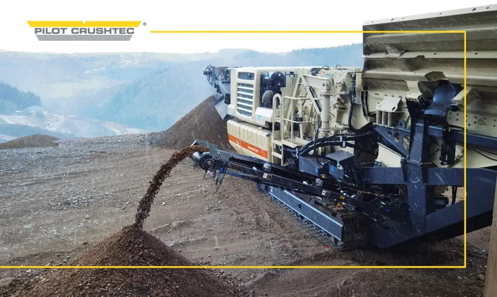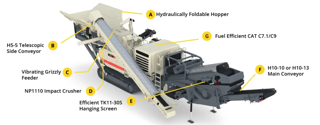 The mobile impact crusher unit includes an H5-5 telescopic side conveyor that sets up quickly for transport and operates at high speed to maximize stockpile capacity.