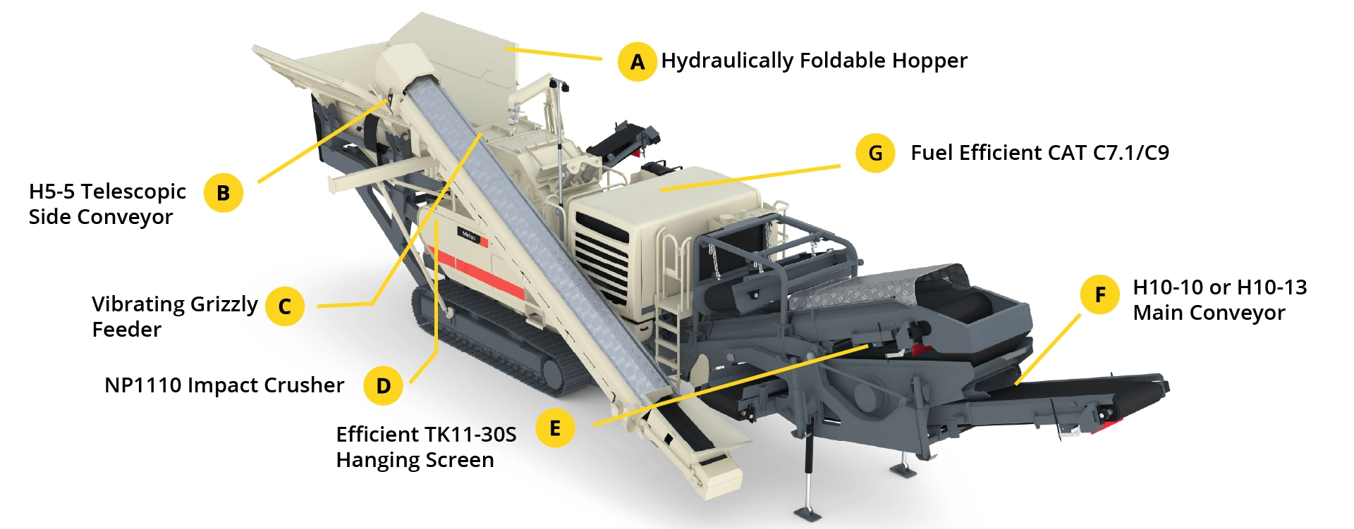 A fuel-efficient CAT C7.1/C9 powertrain features a hydraulic crusher drive, optimised hydraulic system efficiency, and reduced oil volume to lower operating costs.