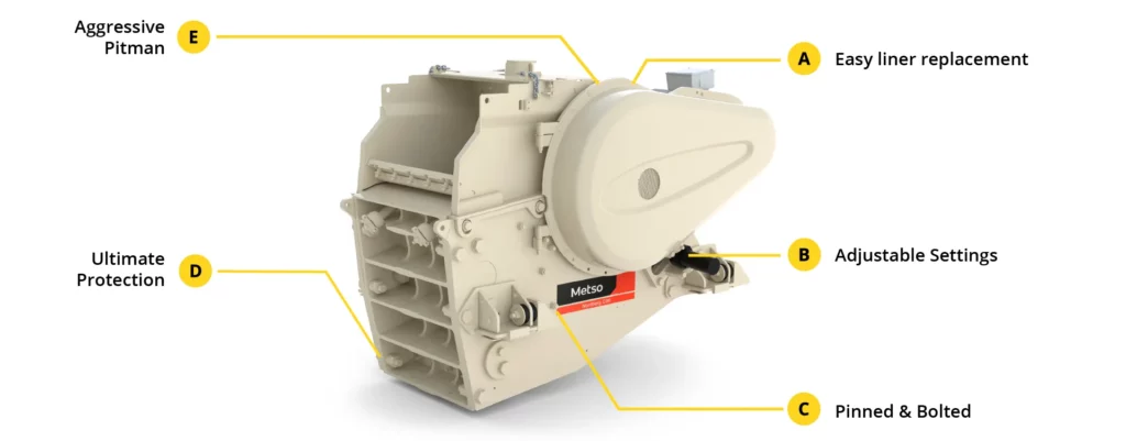 Protection plates behind the jaw dies protect the steel castings against wear. Continuous development of high quality castings with long ribs in two directions assist with long term reliability of crusher main frames.