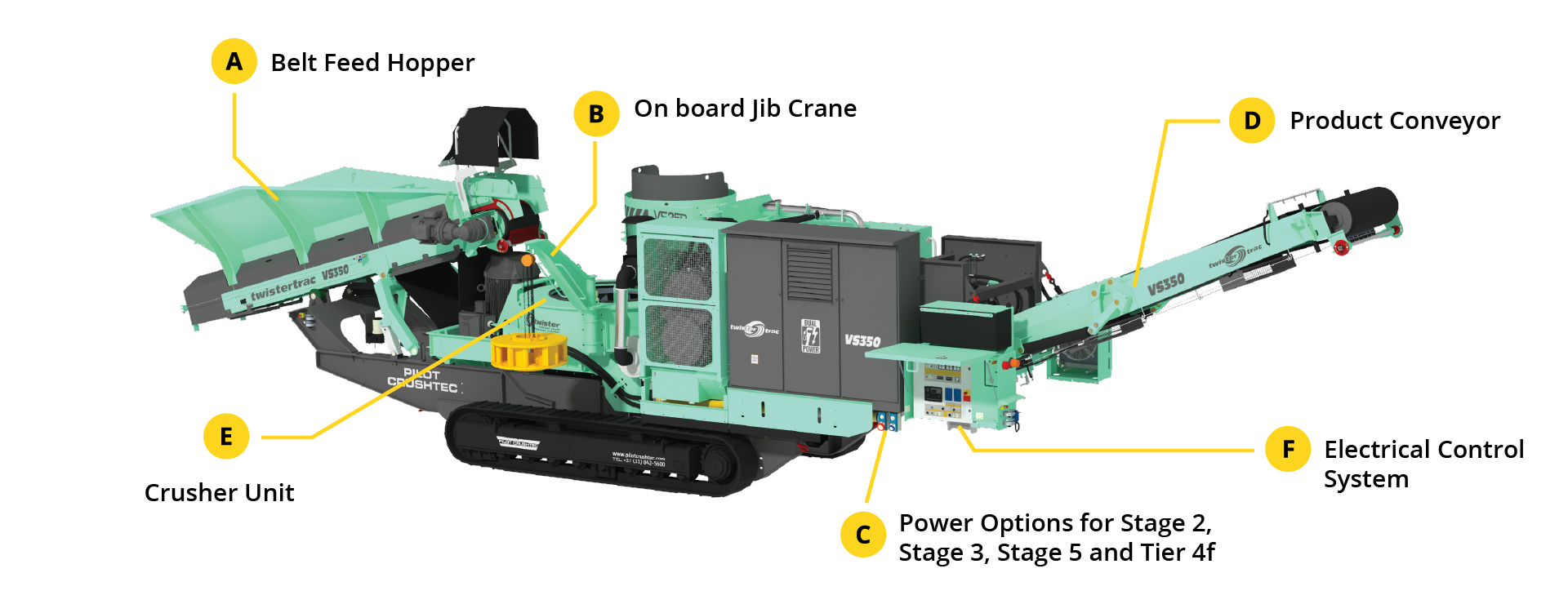 The TwisterTrac VS350 has Diesel/Electrical or Diesel/Hydraulic drive configurations with different emission options to suit local requirements to drive the VSI crusher and auxiliary systems, ensuring high efficiency and compliance with stringent emissions standards.